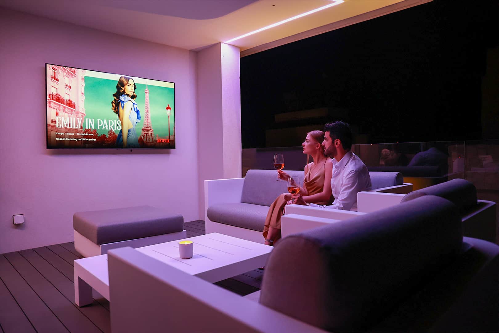 - 75-inch flat screen Samsung TV on roof garden