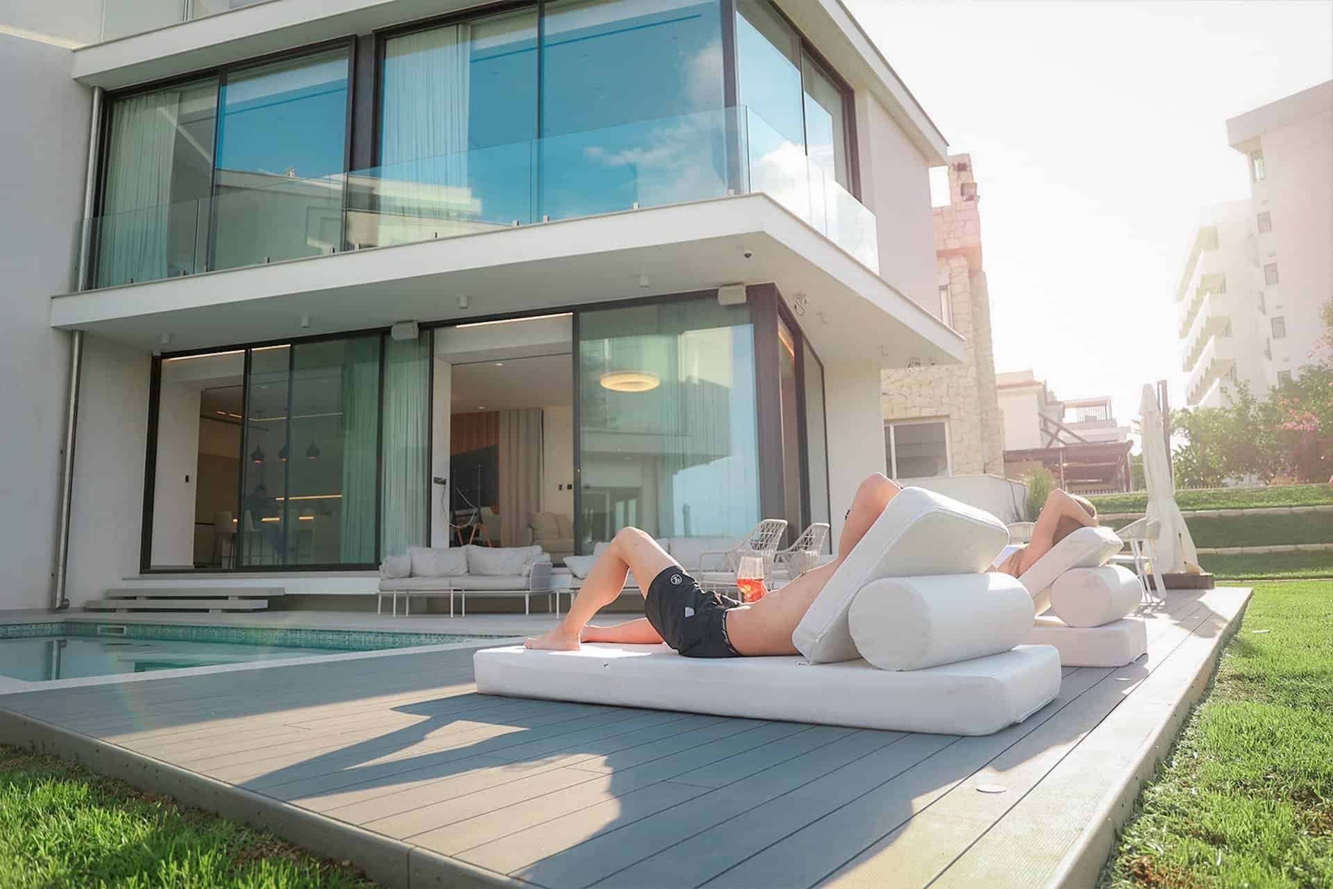 The outdoor area 92sqm includes a swimming pool 7.70*3.2m, a deck area with 6 sunbeds a dining area and a lounge area.