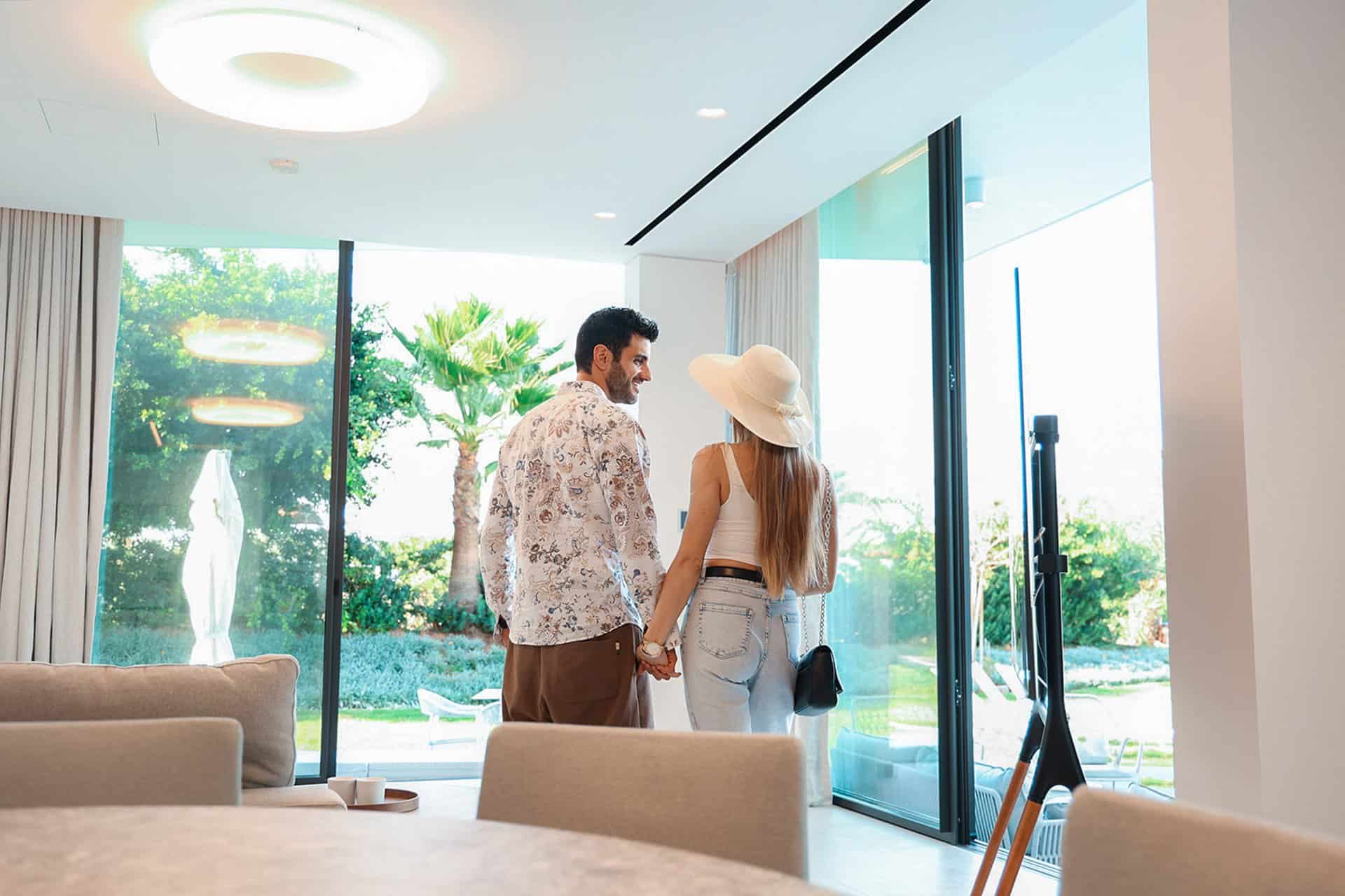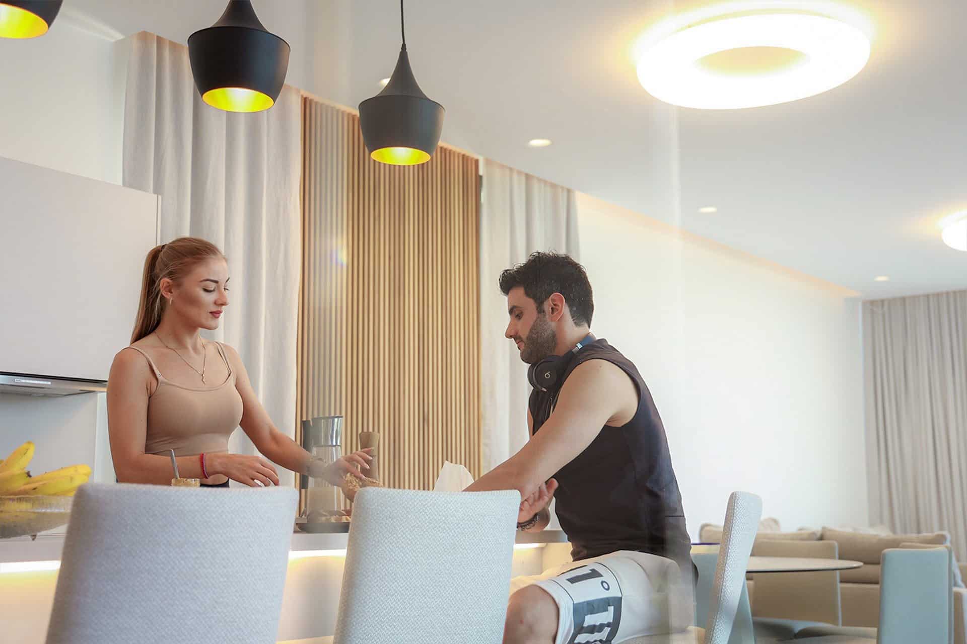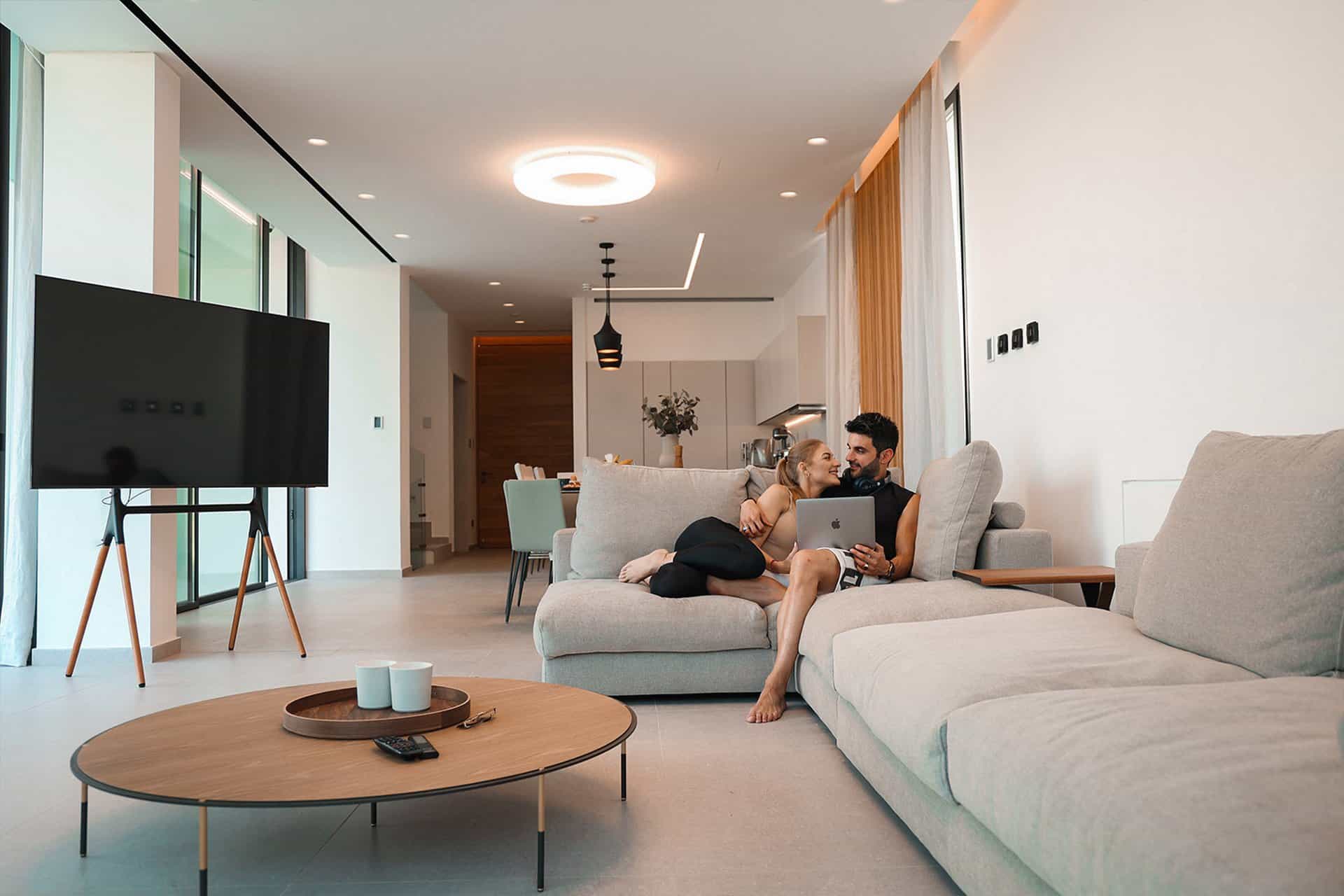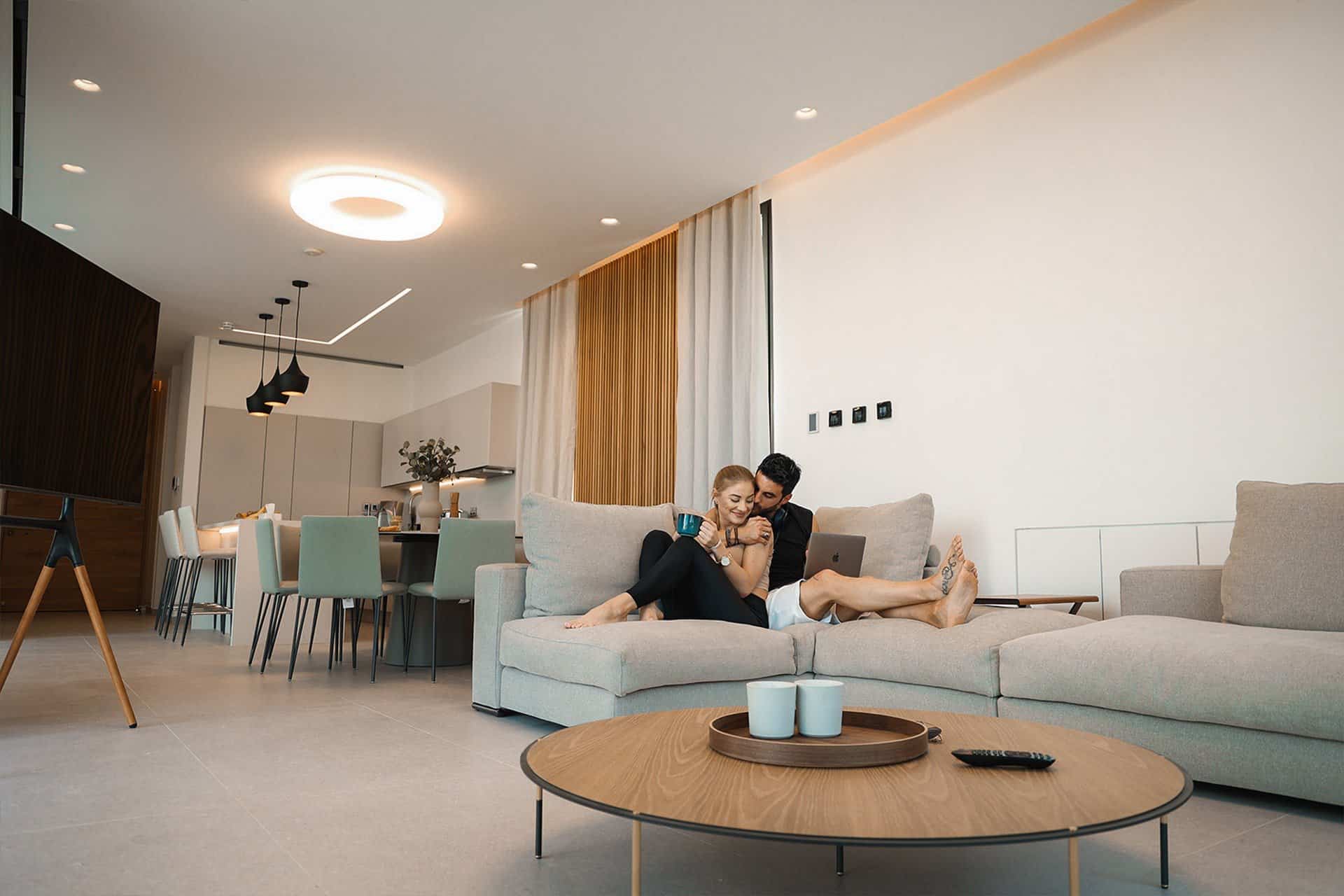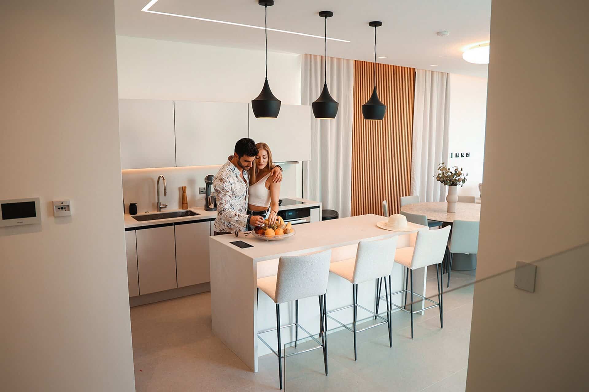 On the ground floor 82 sqm you can find the kitchen a 3 seater island, 8-seat dining table a living room area with a flat-screen tv and guest bathroom.